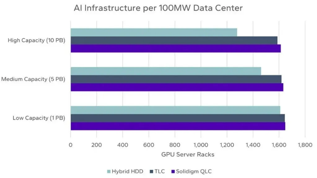 在实际的测试过程中,Solidigm构建了一个全新的100兆瓦AI数据中心模型,旨在评估QLC固态硬盘、TLC固态硬盘以及混合部署机械硬盘的影响。研究结果显示,QLC固态硬盘在能效方面表现突出,相比TLC固态硬盘提高了19.5%,而与混合使用TLC固态硬盘和机械硬盘的方案相比,其能效更是显著提升了79.5%。这一优势使得在同一数据中心内,采用QLC固态硬盘时可以部署更多的全套AI基础设施。