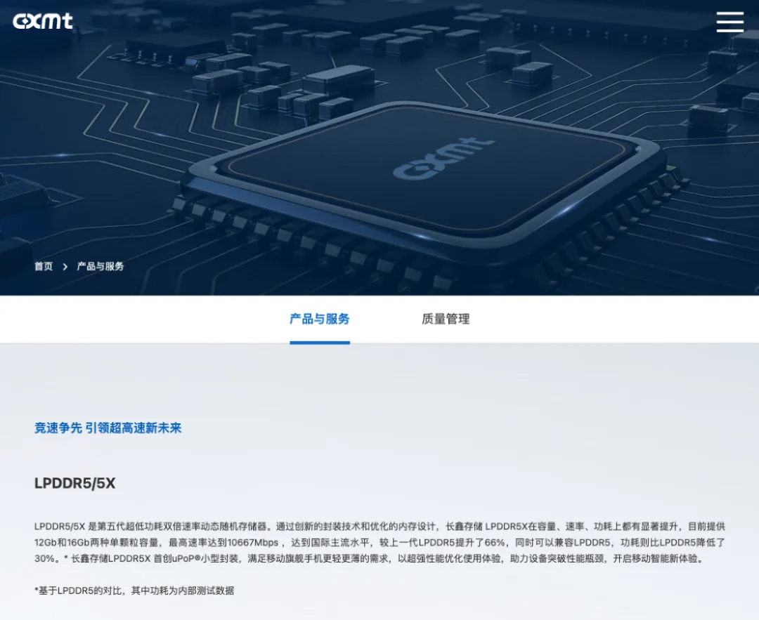 根据长鑫存储官方网站的信息更新,该公司已正式发布了LPDDR5X产品。